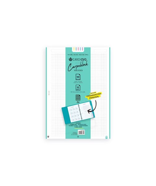 Mantén tu Carpeblock de CARCHIVO® siempre organizado con este recambio de 100 hojas de 90 g/m², certificado con FSC Mix y EU ECO-LABEL. Ideal para estudiantes, este pack incluye herramientas de organización como un calendario, planning anual, semanal, tracker de estudios y planning de estudios. Perfecto para seguir el ritmo escolar de manera eficiente, con la garantía de calidad de CARCHIVO®.