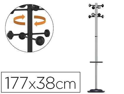 Perchero fabricado en acero. Con 8 perchas redondeadas para no dañar las prendas. El cabezal giratorio permite un fácil acceso a todas las prendas. También cuenta con paragüero ajustable en altura con capacidad para 9 paraguas y bandeja de goteo. La base pesa 6 kg, asegurando así la estabilidad del perchero. Medidas: ø 34 x 175 cm. Peso: 8,44 kg.