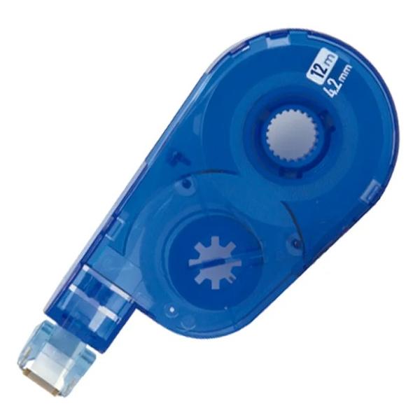 Cinta correctora con diseño ergonómico y con forma de bolígrafo. Cinta correctora blanca de 4,2 mm x 6 m. Permite reescribir de inmediato. Cabezal flexible. Mini rodillo. Color exterior azul. 2 formas de corrección: apriete o arrastre. Carcasa de poliestireno reciclado. Medidas del corrector: 25 x 18 x 110 mm. Persentación en blister.