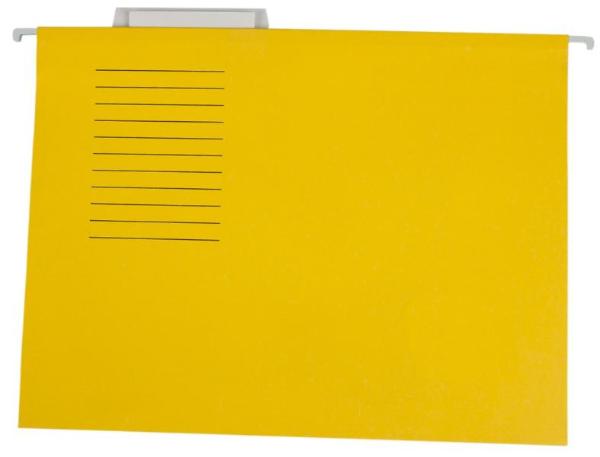 Carpeta colgante liderpapel a4 amarilla. Fabricada en cartulina kraft de 250 g/m². Incluye visor con tira de cartulina trepada. Varillas metálicas. Lomo en v.