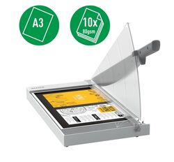 La guillotina de papel Leitz Precision Home Office A3 es perfecta para su uso en casa y en la oficina para cortar papel, etiquetas, películas, fotos, hojas plastificadas y tarjetas. Esta robusta y ligera cortadora de papel doméstica cortará sin esfuerzo hasta 10 hojas de papel A3 (80 grs) con rapidez y precisión. Cuenta con la exclusiva tecnología de luz EdgeGlow que ilumina el filo de corte para una mayor visibilidad y máxima precisión. La abrazadera de papel manual y transparente mantiene el papel seguro, mientras que el mango ergonómico garantiza un corte cómodo y fácil. Es rápido y fácil alinear el papel con las sencillas líneas de la cuadrícula métrica, las guías de ángulos y las reglas de medición en la superficie de trabajo lisa y plastificada. El seguro de la hoja de corte ofrece una protección total y el pestillo de seguridad mantiene la hoja de corte bloqueada mientras no se utiliza. Con una cuchilla de acero inoxidable de alta calidad, una superficie de trabajo resistente y una garantía ampliada de 3 años, tendrás la tranquilidad de que esta guillotina de papel te proporcionará un corte preciso durante muchos años.